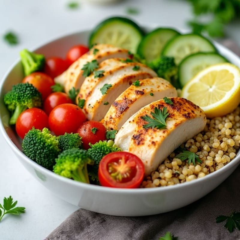 Savor the freshness of herb-marinated chicken paired with protein-packed quinoa and a medley of crisp, fresh vegetables. This vibrant bowl is finished with a zesty lemon-garlic dressing and a sprinkle of fresh parsley, creating a light yet satisfying meal perfect for any time of the day.