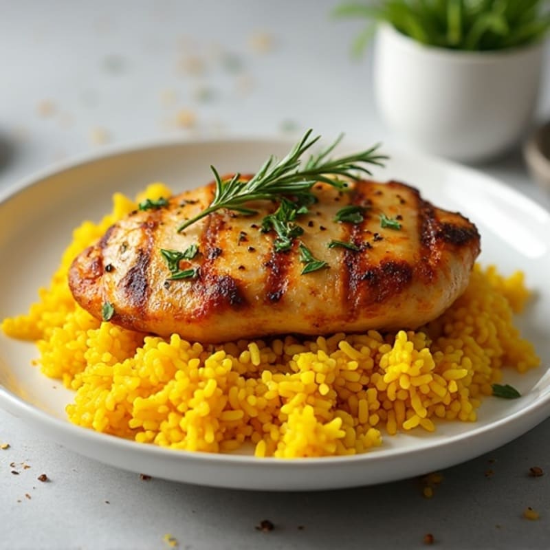 Savor the delightful blend of succulent herb-roasted chicken paired with fragrant, fluffy turmeric rice. This balanced dish brings together the earthy aroma of fresh herbs, a hint of citrus, and the vibrant color of turmeric for an inviting presentation that satisfies both your taste buds and nutritional goals.
