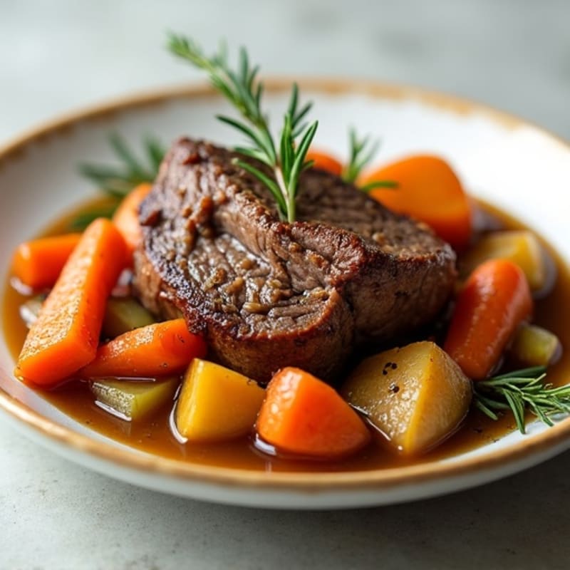 Enjoy a hearty and fragrant pot roast featuring tender slices of lean beef infused with garlic and fresh herbs, braised together with a medley of root vegetables. This comforting dish delivers a savory, satisfying flavor with every bite, perfect for a warming dinner that fits perfectly into balanced eating.
