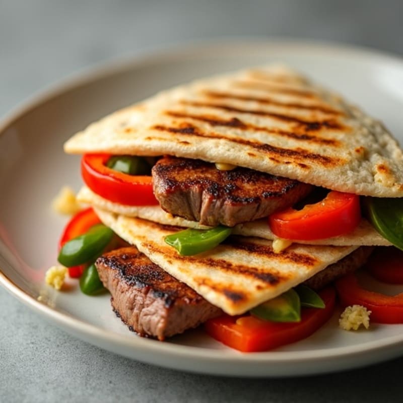 A flavorful quesadilla featuring juicy grilled steak paired with lightly charred bell peppers, melty low-fat cheddar, and a whole wheat tortilla. Perfectly balanced, this dish brings together savory protein and fresh veggies with a hint of grilled olive oil magic.