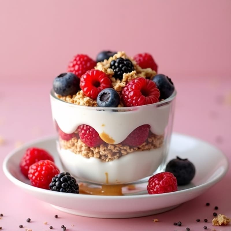 A vibrant and satisfying morning parfait featuring velvety nonfat Greek yogurt layered with fresh mixed berries, crunchy granola, a drizzle of almond butter, and a sprinkle of chia seeds. Enjoy the delightful textures and natural sweetness that make your breakfast both nourishing and delicious.