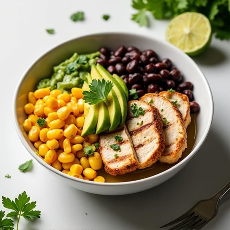 A vibrant, satisfying bowl featuring tender grilled chicken breast, hearty black beans and sweet roasted corn, all elevated with a zesty cilantro-lime dressing and a touch of creamy avocado. This dish is a bright, balanced meal perfect for any time of day.