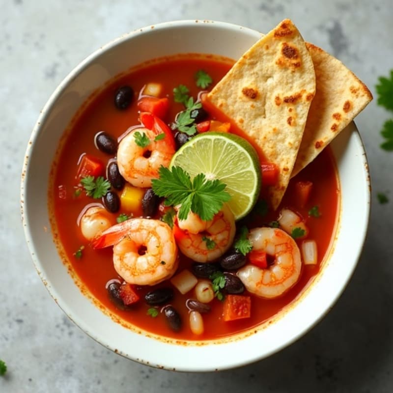 A vibrant and zesty soup brimming with succulent shrimp, hearty black beans, and crisp vegetables simmered in a light, spicy broth accented with fresh lime and aromatic cilantro. The aromatic infusion of garlic, jalapeño, and red bell pepper creates a warming depth, while homemade baked tortilla strips add a delightful crunch to every spoonful.