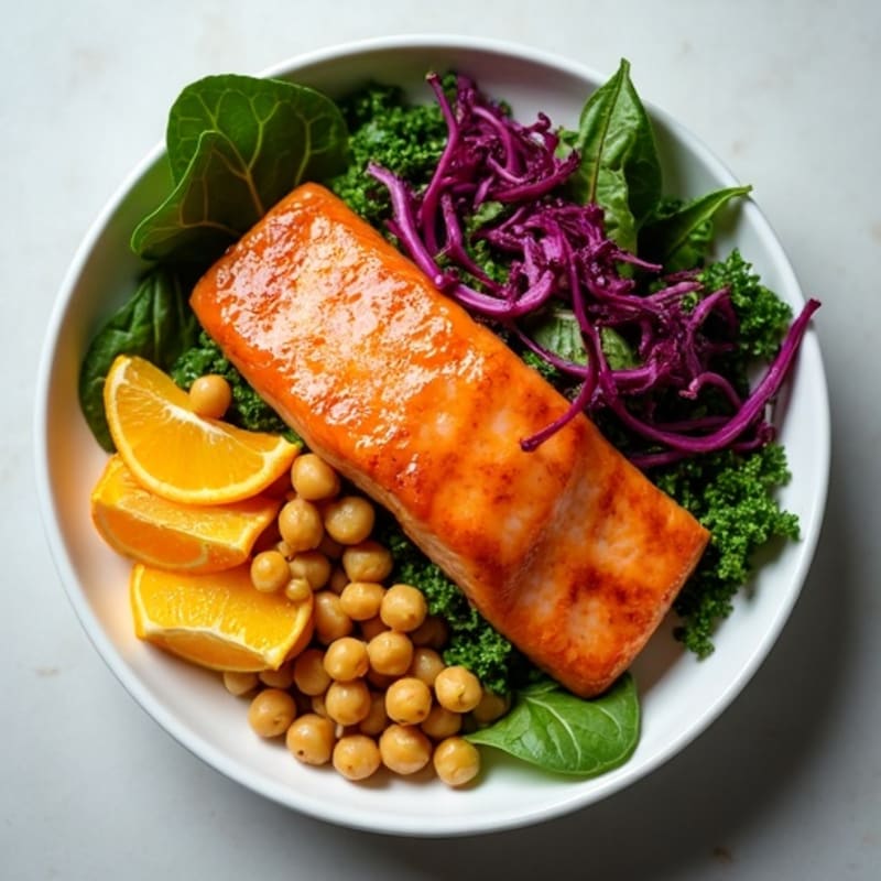 A vibrant power bowl featuring succulent, citrus-glazed salmon paired with hearty chickpeas and a refreshing mix of crunchy greens. This bowl offers a balance of lean protein, fiber-rich chickpeas, and a bright citrus dressing to elevate the flavors, making it a perfect choice for a satisfying meal any time of day.