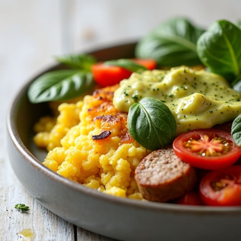 A light yet satisfying egg white scramble loaded with fresh spinach, crisp bell peppers, and savory turkey sausage, finished with a creamy avocado topping and a touch of olive oil. Perfect for a high-protein, low-calorie start to your day.