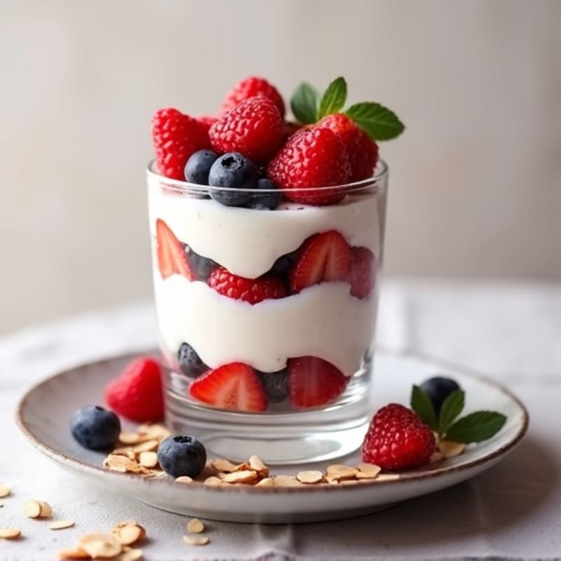 Enjoy a delicious, high-protein parfait that layers smooth nonfat Greek yogurt with a scoop of vanilla whey protein powder, fresh mixed berries, and a sprinkle of crunchy chopped almonds, finished with a hint of flaxseed oil for a subtle nutty flavor. This dessert balances indulgence with clean, nutrient-dense ingredients.