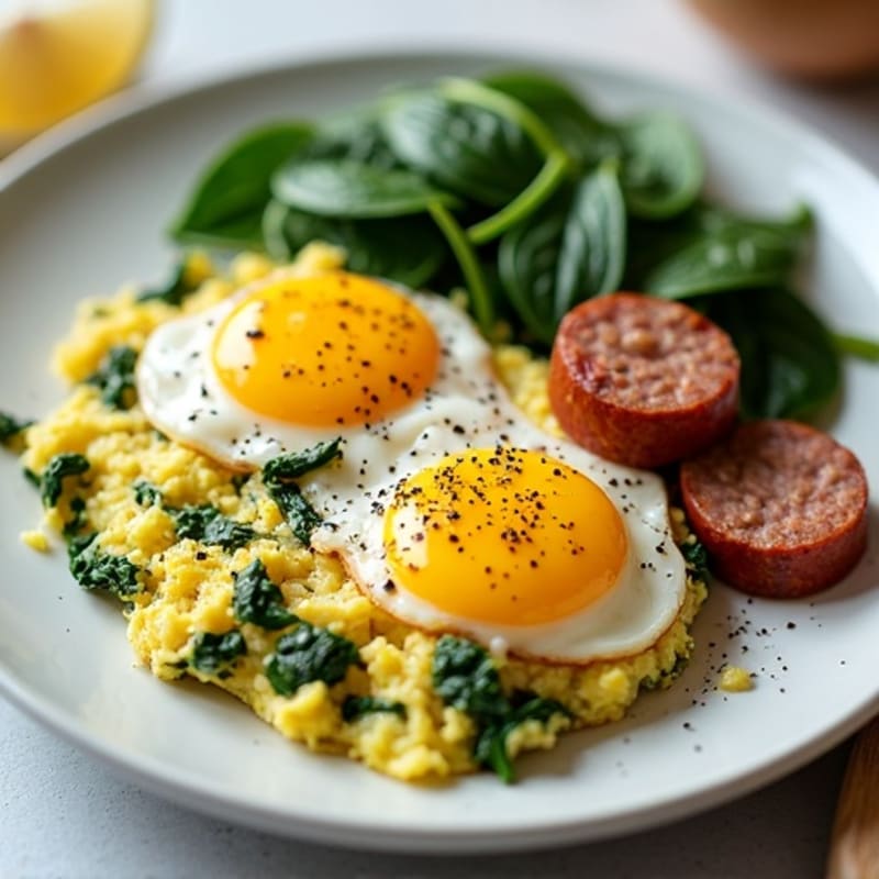Start your day or refuel any time with this vibrant protein-packed scramble featuring a blend of light egg whites and rich whole eggs, complemented by savory turkey sausage, fresh spinach, and a hint of sweet onion. A satisfying dish that balances lean protein with nutrient-dense veggies perfect for a health-conscious meal.