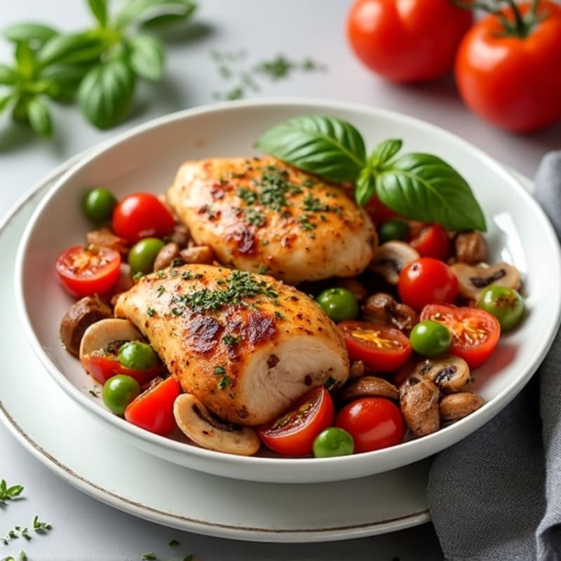 Savor a rustic twist on traditional chicken cacciatore with tender herb-roasted chicken paired with a medley of garden vegetables. This vibrant dish features juicy chicken enhanced by aromatic garlic and herbs, simmered with fresh tomatoes, bell peppers, onions, and mushrooms to create a hearty yet light meal perfect for dinner.
