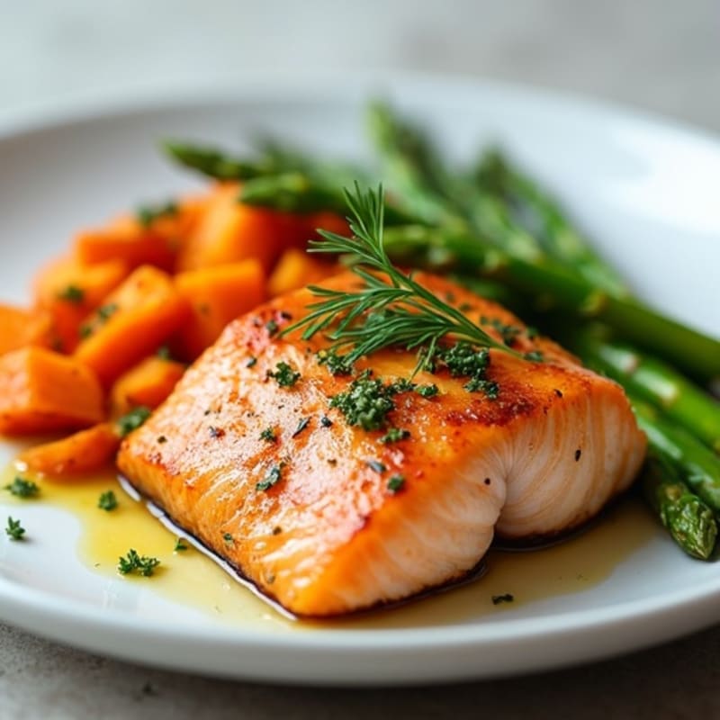 Enjoy a vibrant medley of flavors with perfectly seared salmon teamed with tender roasted sweet potato and crisp asparagus. The salmon is infused with a light citrus herb seasoning while the vegetables are roasted to bring out their natural sweetness, making this a balanced, clean dinner to fuel your evening.