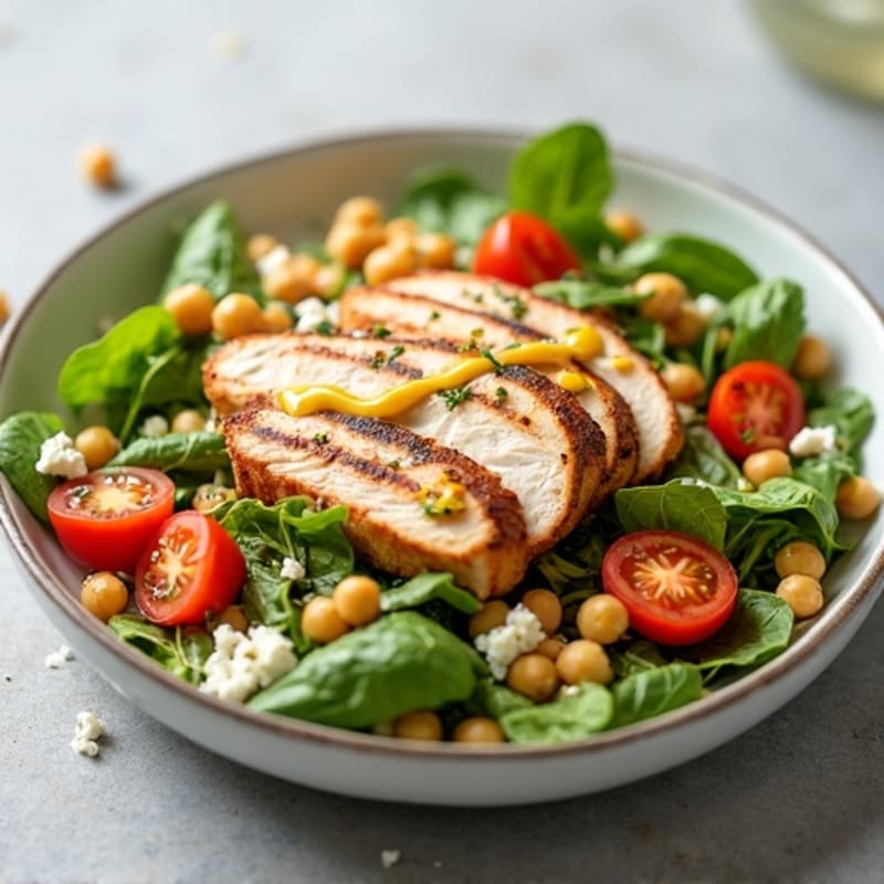 Enjoy a vibrant salad featuring lean grilled turkey breast paired with hearty chickpeas, crisp mixed greens, juicy cherry tomatoes, and tangy crumbled feta, all brought together with a refreshing lemon vinaigrette. This balanced meal offers a satisfying blend of protein, fiber, and bright flavors perfect for a nutritious lunch.