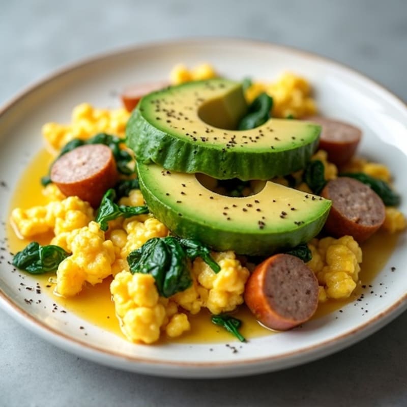 A vibrant morning scramble featuring fluffy egg whites, savory turkey sausage, and fresh spinach tossed in olive oil and topped with creamy avocado. This wholesome plate balances lean protein with healthy fats and a burst of green goodness to kickstart your day.
