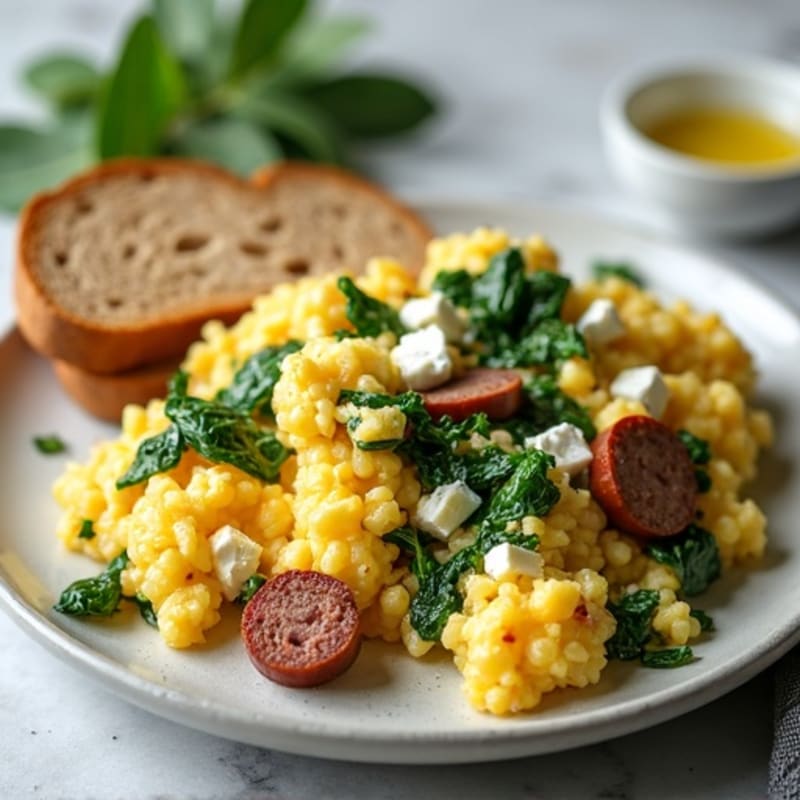 A light yet satisfying breakfast scramble featuring fluffy egg whites, fresh spinach, savory turkey sausage, and tangy feta cheese, all complemented by a crisp slice of whole grain toast and a hint of olive oil to bring everything together.