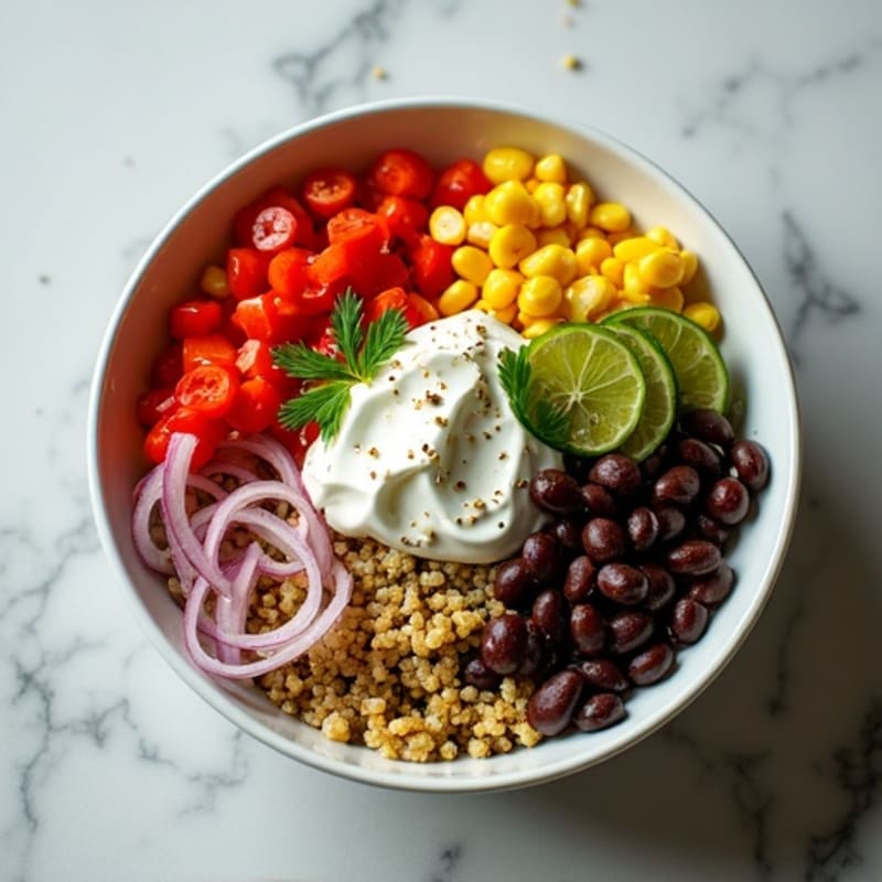 A vibrant bowl featuring fluffy quinoa, hearty black beans, and sweet corn, tossed with crisp red bell peppers and red onion. The dish is elevated by a tangy, zesty lime cilantro sauce enriched with creamy nonfat Greek yogurt and a drizzle of olive oil, creating an exciting mix of spicy and fresh flavors perfect for any meal of the day.
