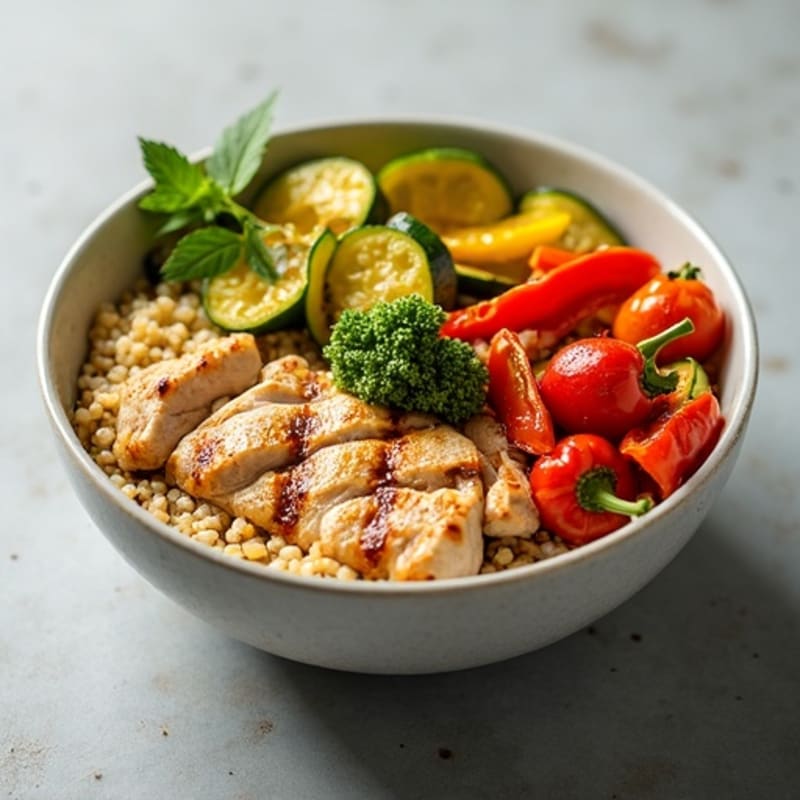 Enjoy a vibrant bowl featuring tender grilled chicken, fluffy quinoa, and a medley of roasted bell peppers and zucchini drizzled with extra virgin olive oil. This dish brings a balance of flavors and textures with minimal fuss, perfect for a satisfying midday boost.