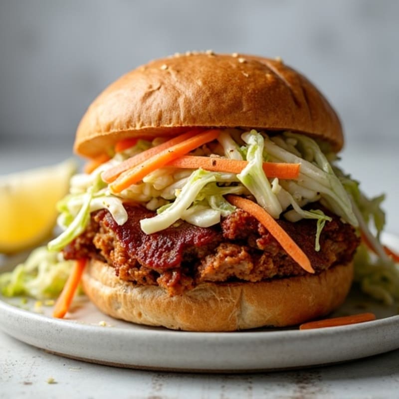 Savor the smoky, savory pulled pork nestled in a whole wheat bun, complemented by a vibrant, tangy slaw dressed in a light Greek yogurt dressing. Each bite offers a delightful contrast of tender meat, crisp vegetables, and zesty finish, making it a balanced meal perfect for a hearty lunch or dinner.