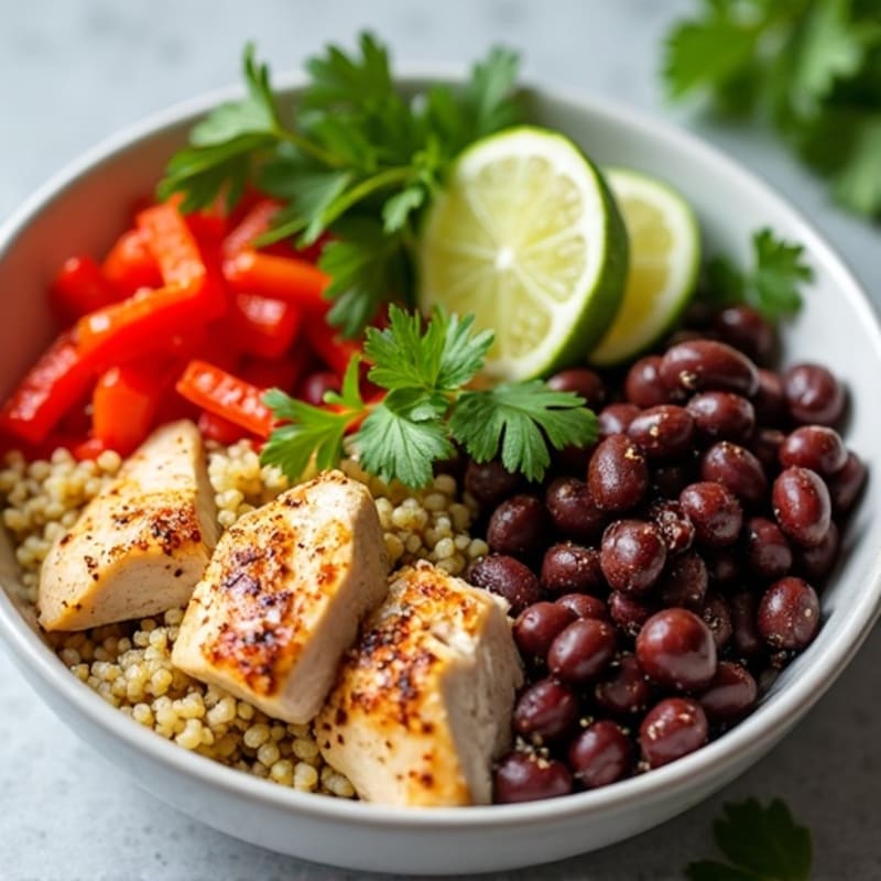 Enjoy a vibrant bowl combining fluffy quinoa, hearty black beans, and perfectly grilled chicken breast, all tossed with zesty lime, crisp red bell pepper, and a dash of olive oil. This colorful dish bursts with fresh flavors and a satisfying texture, making it an ideal meal for any time of day.