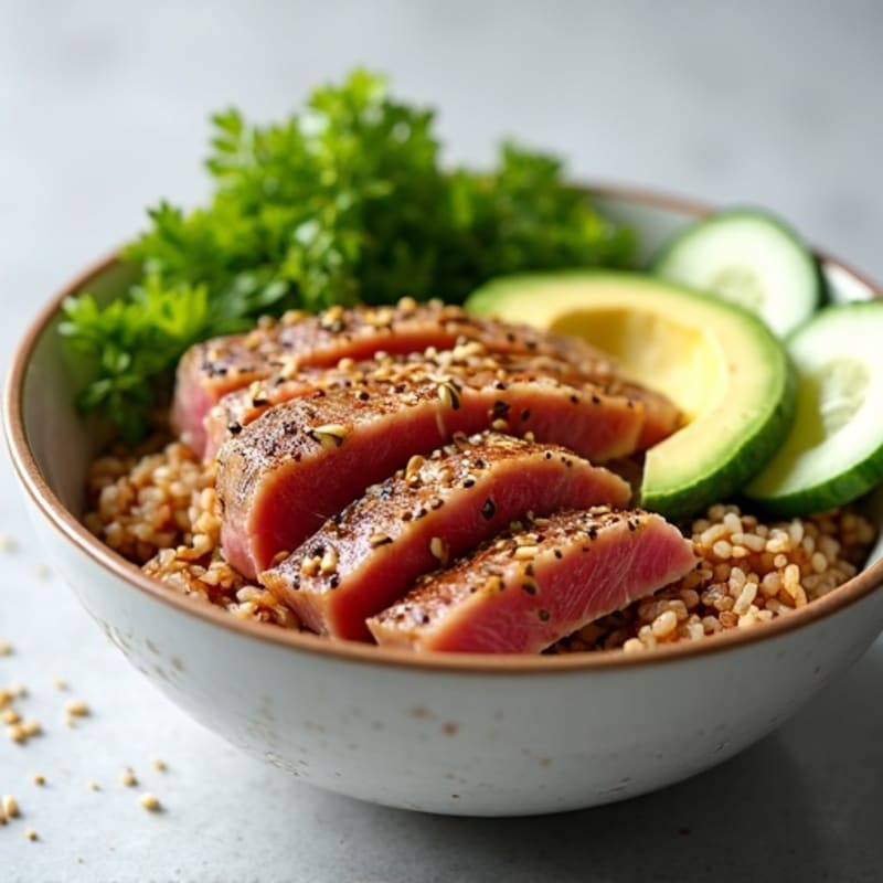Enjoy a vibrant bowl featuring perfectly seared tuna paired with freshly sliced avocado, served atop a bed of nutty brown rice. A light drizzle of sesame-ginger sauce adds a burst of umami and tang, making this dish both refreshing and satisfying.