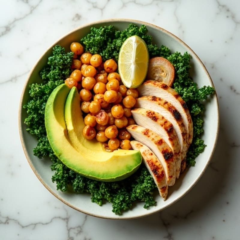 Enjoy a refreshing and filling bowl featuring tender grilled chicken, perfectly roasted crunchy chickpeas, and creamy avocado nestled atop a bed of massage-soft kale. Finished with a bright, citrus vinaigrette, this dish delivers texture, vibrant flavors, and a satisfying nutrient boost.