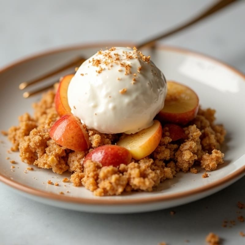 Serve warm with a side or dollop of nonfat Greek yogurt, enjoying the contrast of creamy yogurt with the warm, spiced crumble.