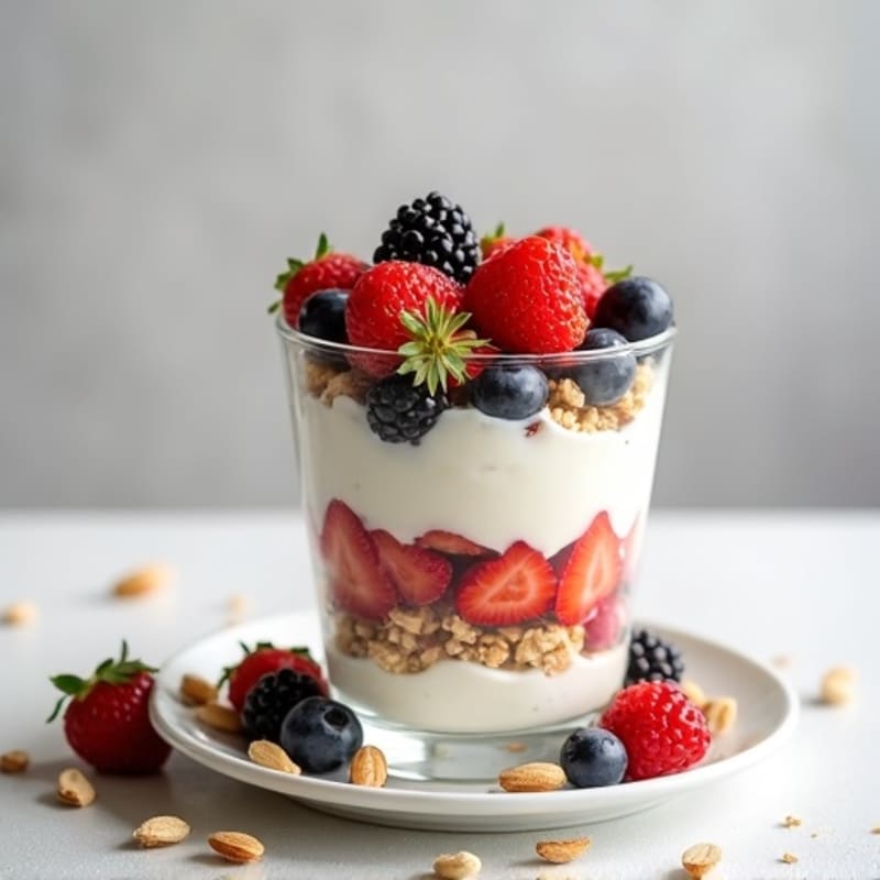 A light and refreshing layered parfait featuring smooth low-fat cottage cheese, a medley of juicy mixed berries, crunchy slivered almonds, and a sprinkle of granola for added texture. Perfect for a balanced breakfast that not only satisfies your sweet cravings but also aligns perfectly with your nutritional goals.