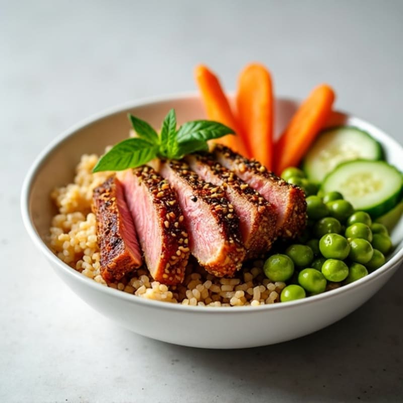 Enjoy a vibrant bowl featuring a lightly seared, sesame-crusted tuna steak atop a bed of nutty brown rice and crisp fresh vegetables. This dish combines an exquisite balance of flavors and textures, perfect for any meal of the day.