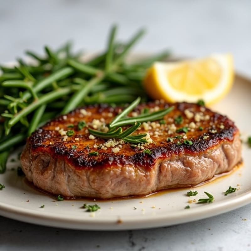 Savor the bold flavors of a perfectly pan-seared lean sirloin steak with a fragrant garlic-herb crust. This dish features a beautifully seared exterior and a tender, juicy interior, accented with minced garlic and fresh rosemary and thyme. An easy, quick meal that perfectly balances protein and healthy fats.