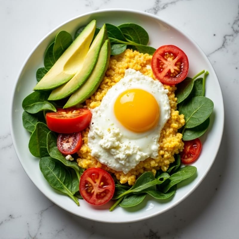 A light yet satisfying morning scramble featuring fluffy egg whites blended with a whole egg for richness, tossed with fresh spinach, juicy tomatoes, and a dollop of creamy cottage cheese. Finished with a drizzle of olive oil and a few slices of avocado, this dish balances protein and healthy fats for a nourishing start to your day.