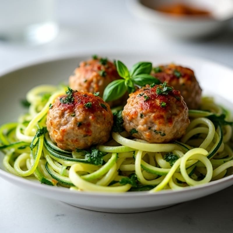 While the meatballs are baking, prepare the zucchini noodles by spiralizing fresh zucchini. If desired, lightly sauté the noodles in a nonstick pan for 1-2 minutes to warm them up, keeping them crisp.