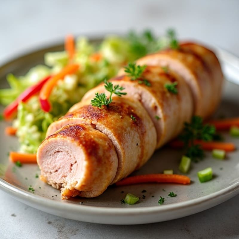 Enjoy a protein-packed meal featuring a lean chicken sausage embraced by tender turkey breast slices, paired with a vibrant and crunchy fresh slaw dressed in a zesty lemon olive oil vinaigrette. Perfect for any meal, this dish balances lean proteins with crisp vegetables for a satisfying bite.