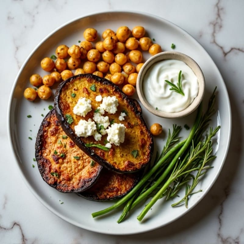 Once the eggplant is done, plate the steaks and top them with a sprinkle of crumbled feta cheese. Serve with a side of roasted chickpeas and a dollop of the herbed Greek yogurt dip.