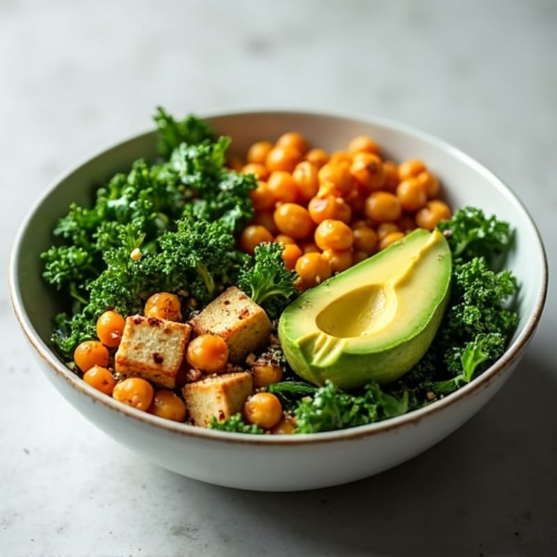 A vibrant bowl featuring fresh chopped kale, creamy avocado, crispy pan-toasted tofu, and crunchy roasted chickpeas, all enhanced with a tangy citrus vinaigrette and sprinkled with protein-rich hemp seeds. This balanced dish delivers a satisfying mix of textures and refreshing flavors perfect for a light, nutritious meal any time of day.