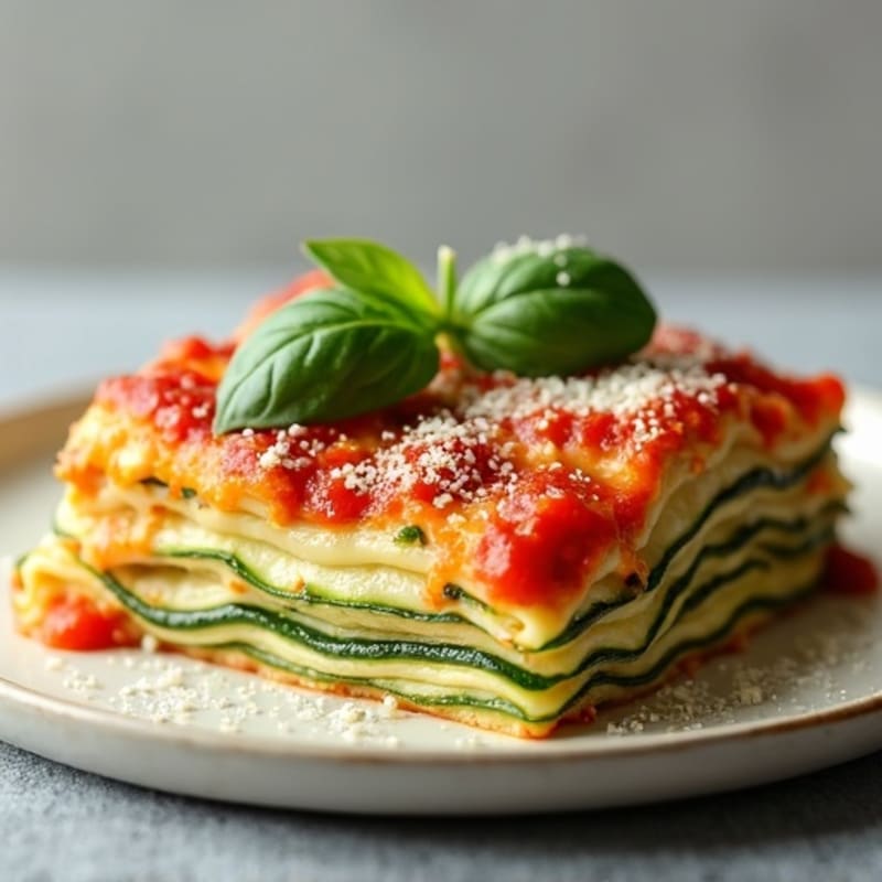 Enjoy a light yet satisfying lasagna that swaps traditional pasta for thinly sliced zucchini, layered with creamy part-skim ricotta, savory lean ground turkey, and bright tomato sauce, finished with a sprinkle of parmesan and fresh spinach for a nutrient-packed meal.