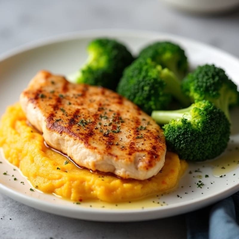 Enjoy a well-balanced dinner featuring a perfectly seared chicken breast paired with creamy mashed sweet potato and crisp steamed broccoli. The dish is enhanced with a drizzle of olive oil for a silky finish and subtle flavor boost, making it both satisfying and nutritious.