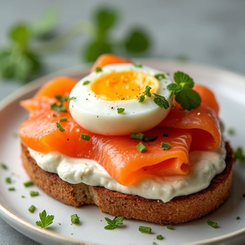 Savor the delicate balance of smoky salmon paired with a light, whipped herb cream cheese spread atop toasted sourdough, crowned with a protein-boosting hard-boiled egg white. This open-faced delight offers a harmonious blend of flavors and textures, making it a versatile meal for any time of the day.