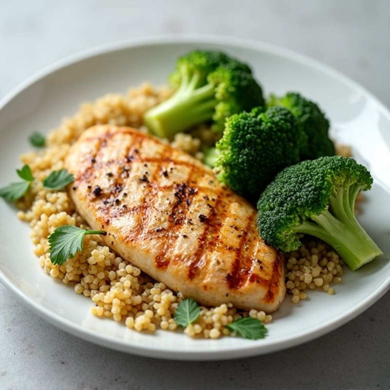 Plate the dish by placing the cooked quinoa as a base, topping with slices of grilled chicken breast, and arranging the roasted broccoli on the side.