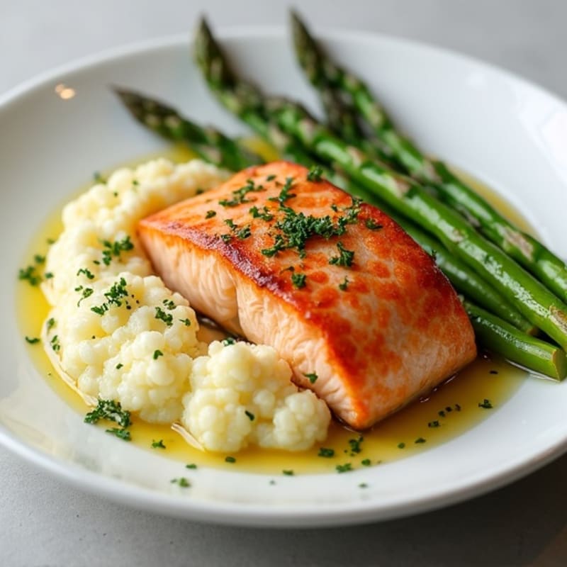Enjoy a beautifully balanced dinner featuring a perfectly seared salmon fillet paired with tender steamed asparagus and a creamy, garlicky cauliflower mash. This dish brings a delightful mix of flavors and textures, with the richness of the salmon contrasting against the light and aromatic vegetable sides.