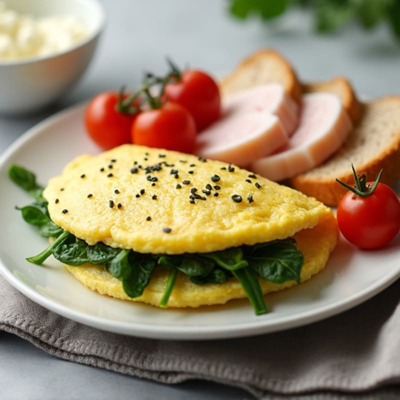Egg White Spinach Omelette with Cottage Cheese and Sliced Turkey with Toast