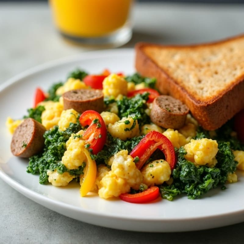 Egg White and Turkey Sausage Scramble with Spinach, Bell Peppers, and Whole Grain Toast