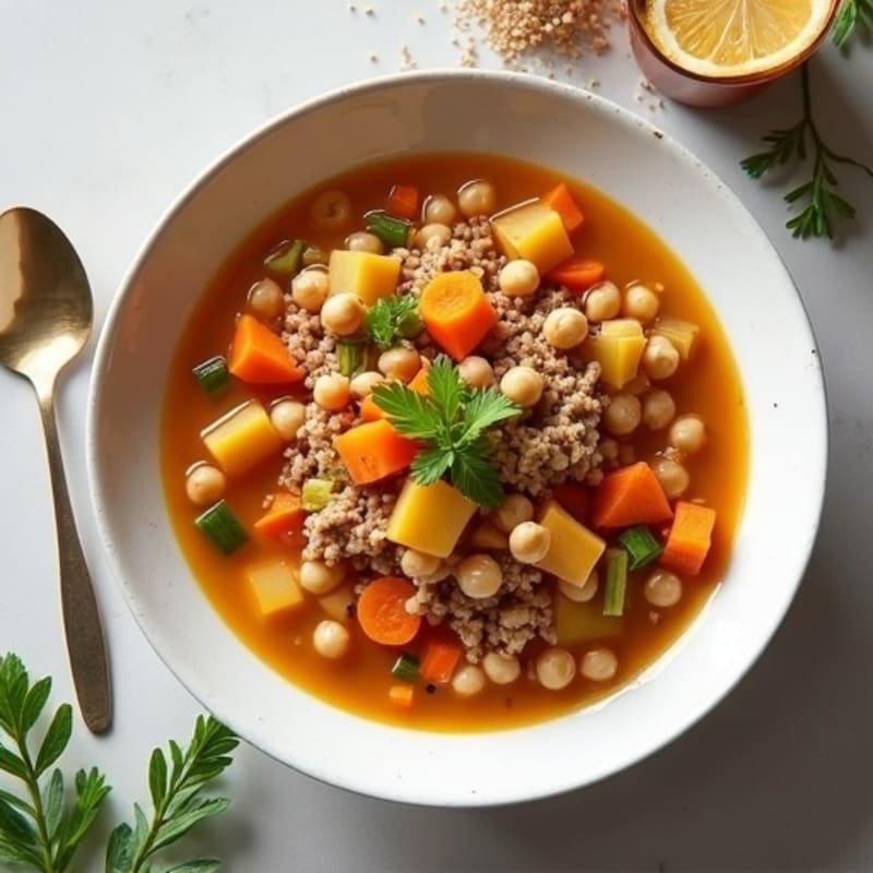 A warming, nutrient-packed stew featuring lean ground turkey, creamy pumpkin, and a medley of root vegetables. This comforting dish is simmered in a flavorful low-sodium broth with a touch of olive oil, making it a balanced meal perfect for breakfast, lunch, or dinner.