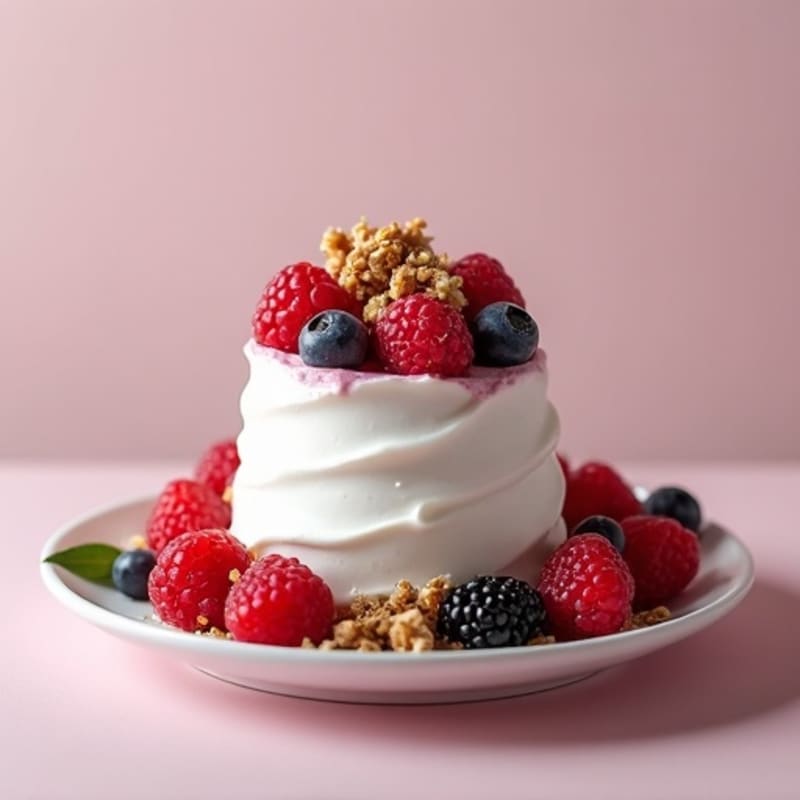 A light and creamy protein mousse that melds the tang of Greek yogurt with the sweetness of mixed berries and honey, accented by a crunchy granola topping. This dessert provides a delightful balance of creamy and crunchy textures with a burst of fresh berry flavor.
