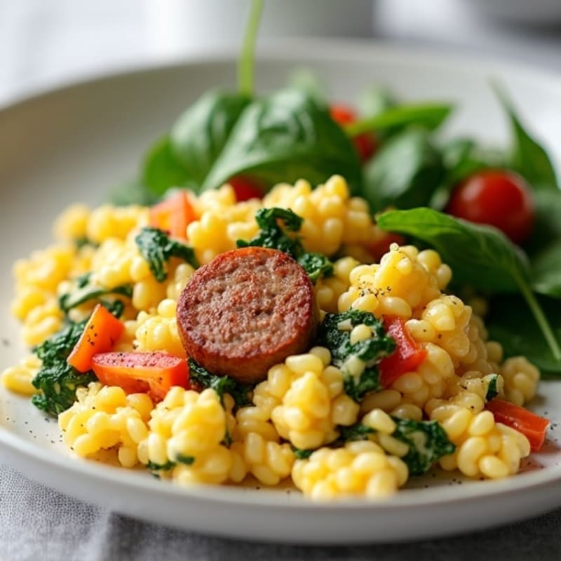 Enjoy a light yet satisfying scramble bursting with fresh spinach and the savory flavor of turkey sausage. This dish combines fluffy egg whites with vibrant veggies, enriched with a dash of olive oil that creates a delightful, low-calorie but nutrient-packed start to your day.